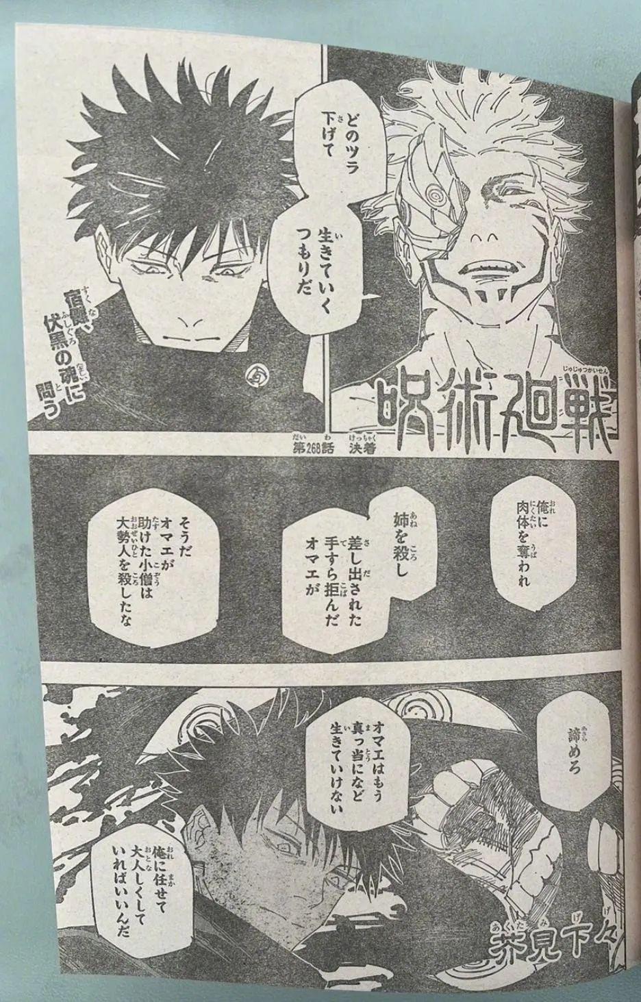 《咒術回戰》268話圖透公佈,宿儺作爲“詛咒”,從伏黑惠的身體中分離出來,最終在和虎杖對話後徹底消失。