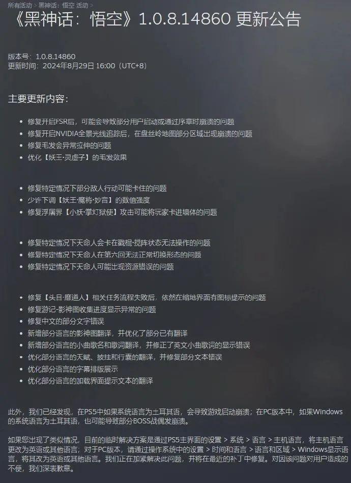 《黑神話:悟空》1.0.8.14860版本補丁已經在Steam上線,主要內容包括修補一部分BUG,並且削弱了魔將妙音的數值強度。