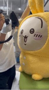 一位師傅擺出一臉嚴肅的表情,手底下卻是在給一個巨大的烏薩奇玩偶吹毛。只見他一手拿着吹風,一手輕柔地撥弄着棉花娃娃的絨毛,手法之輕盈堪比我在寵物店看到洗護師給小貓小狗洗澡。