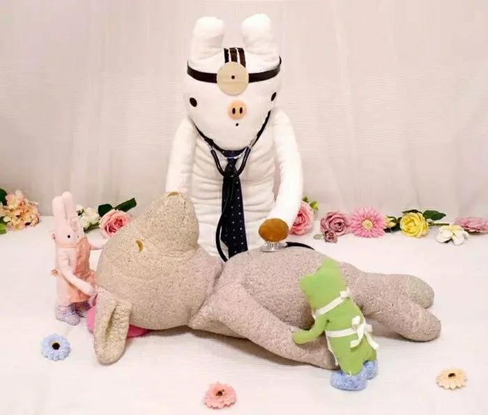 不僅如此,在玩偶們接受治療的時候,醫院還會拍攝玩偶醫生們治療的照片,比如真·玩偶醫生和護士認真治療“病人”時的工作照。