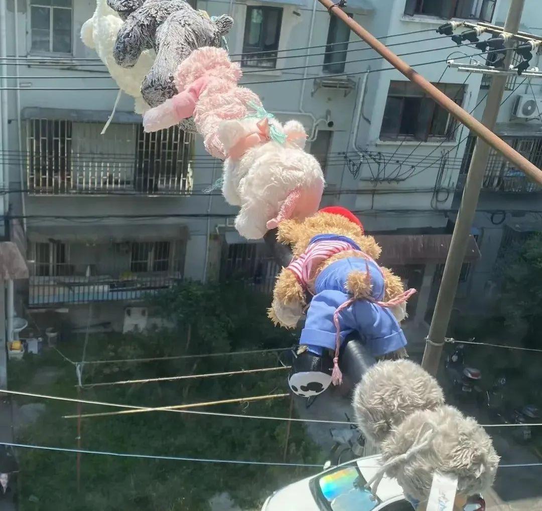 洗娃娃還不算重頭戲,之後的晾曬環節,纔是他們創意比拼的賽場。什麼娃娃“串串香”,娃娃玩倒立,還有用衣架卡脖子曬娃娃的,整個洗曬過程那叫一個怎麼方便怎麼來。