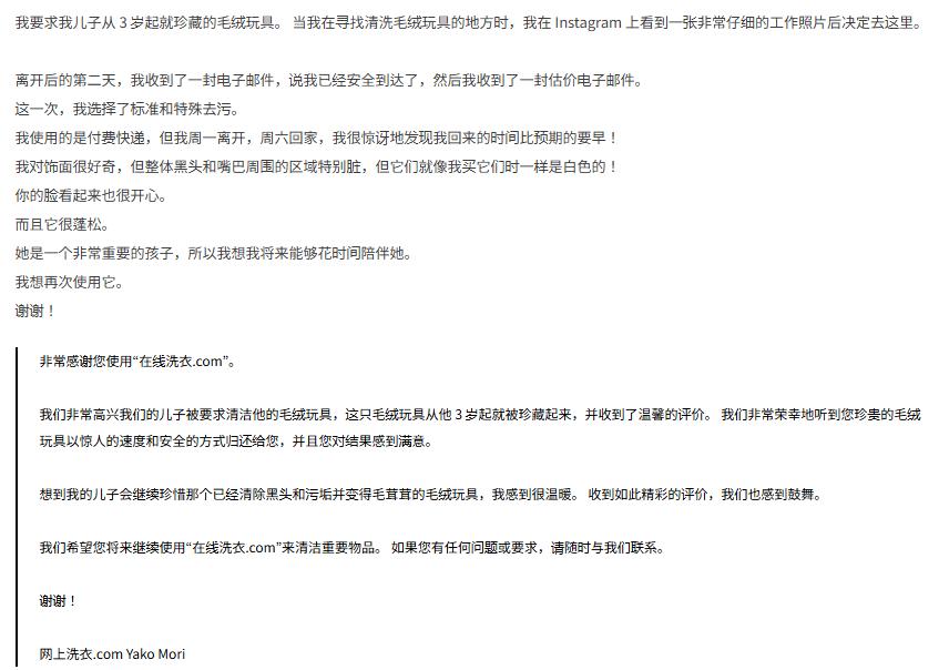 “不少客戶都想要一張清潔毛絨玩具的照片,而與玩偶分開的他們有時候也會產生孤獨感。在我們預約清洗時,客戶們往往會在備註欄寫下他們與玩偶的回憶,在看過那些留言之後,我決定將清洗的過程發送到推特上。”
