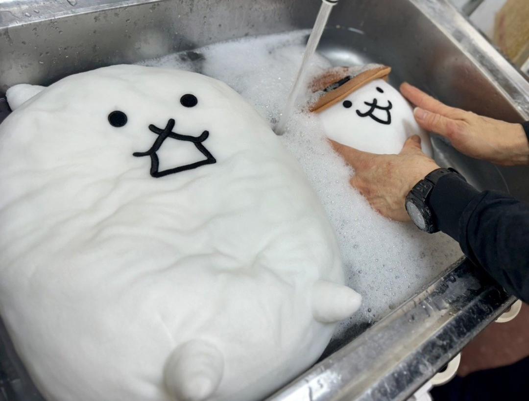 照片裏清潔師一絲不苟的神情,以及對待玩偶小心翼翼的動作,和海豹角色しろたん萌蠢可愛的表情形成了強烈的反差。