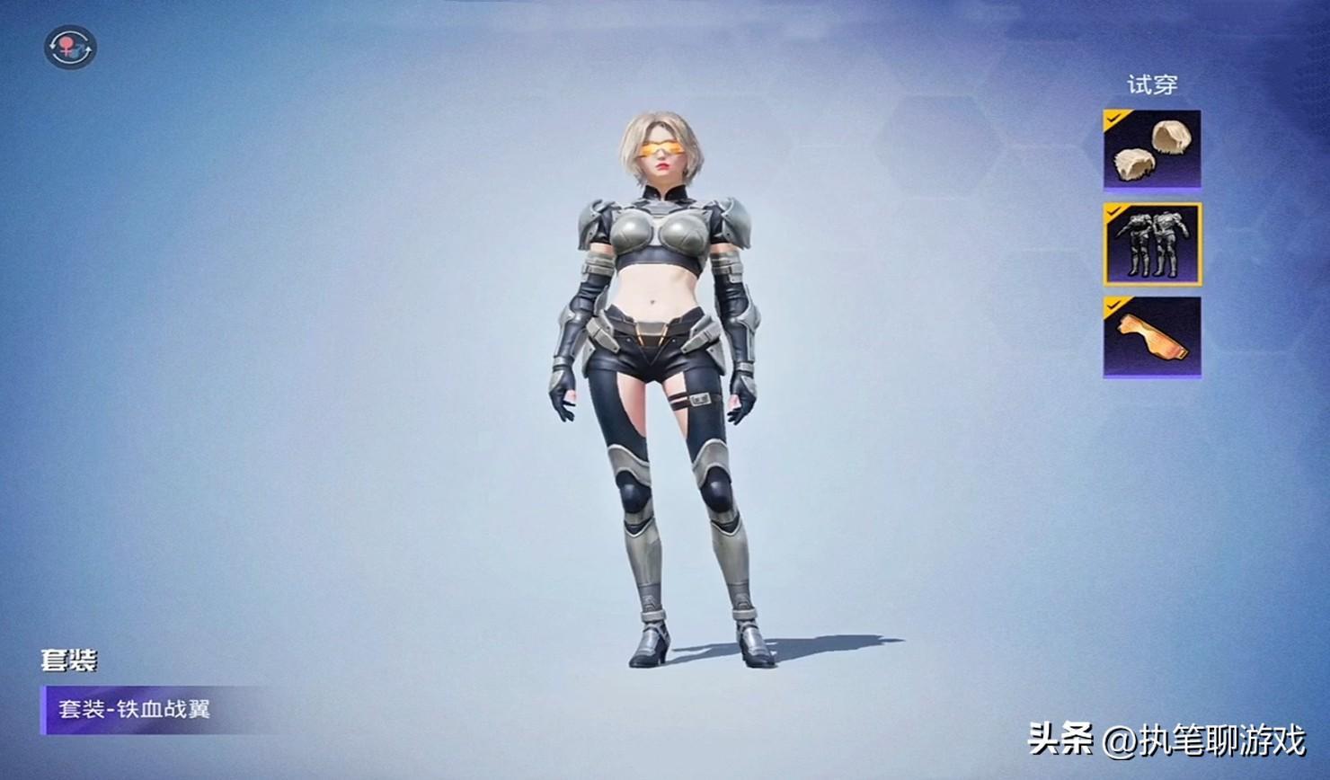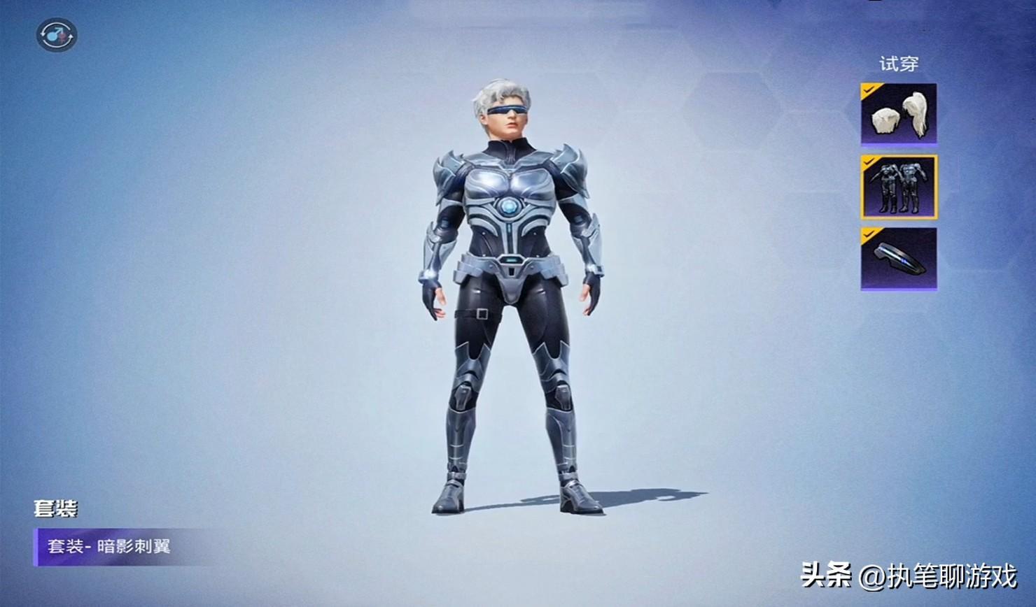 最後壓軸登場的第3個紫色等級套裝,被光子命名爲“暗影刺翼”,同樣是露臍裝的機甲版型設定,而且還是三件套,分爲眼鏡、髮型、衣服,可以讓玩家們DIY。