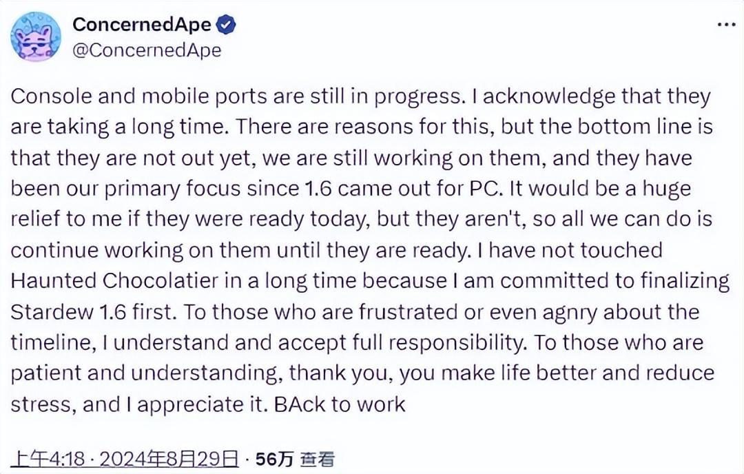 ConcernedApe在貼文中說道:“對於那些對時間表感到沮喪甚至憤怒的人,我理解並承擔全部責任。對於那些耐心和理解的人,謝謝你們,你們讓生活變得更美好,減輕了壓力,我很感激。現在要回去工作了”。