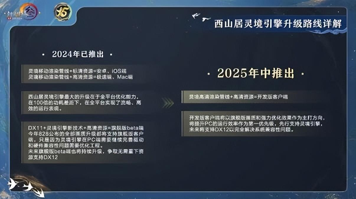 就拿畫面上來說,西山居靠着“靈境引擎”逐步提升遊戲品質的舉措就很有成效,光是在今年便使移動端和極速端的畫面提升了一大步,如今官方更是宣佈將會以旗艦版畫質和強力優化效果作爲主打方向,將提升PC的運行效率作爲第一優先級,先行支持靈境引擎,未來將支持DX12以完全解決系統兼容性問題。