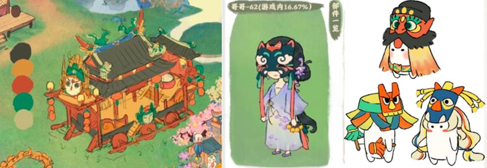 以剛過去的中元節活動爲例,活動主題爲「中元寄思」寓意「寄託對逝者的思念之情」,細節上用非遺「儺文化」的鬼戲儺舞和潮汕英歌舞,來傳遞驅瘟避疫、尋求安慶的意味,並且重點提煉出「儺面具」這個元素,在遊戲中應用到了舞臺、建築、臉飾等細節上。