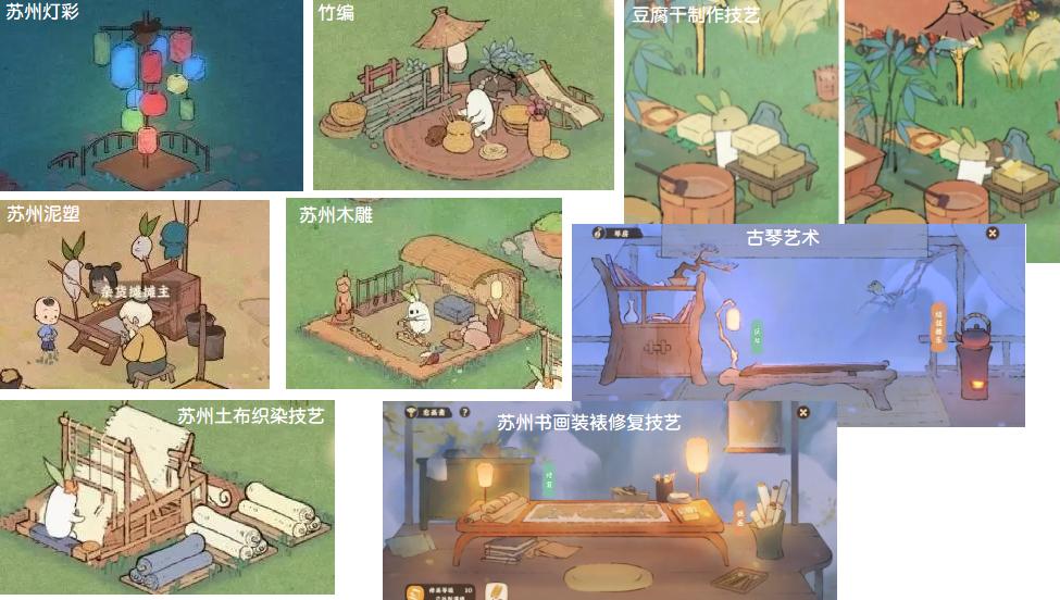 據瞭解,這款遊戲在創作的過程中,融入了至少20種非遺元素,包括崑曲、古琴、蘇繡、江南絲竹、蘇州評彈、蘇州燈綵、盆景技藝、蘇州書畫、蘇式糕點製作技藝、竹編、傳統木船製作技藝、謎語(平望燈謎)等。這些要素乍看之下可能一時間聯想不到非遺內容,但仔細考究就能發現它們背後的文化底蘊。