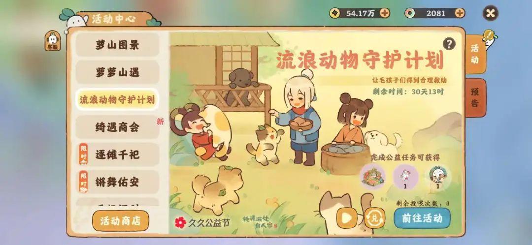 其二,遊戲中玩家本就培養起了到處逛逛、到處與NPC互動的習慣,城市裏有了新的變化,自然會湊上去看個究竟,因此遇到新出現的流浪貓狗時,也能無門檻得與之互動,進而觸發公益活動的玩法機制。相比活動形式出現的公益活動,文化內容與《桃源深處有人家》融合,更是潤物細無聲。