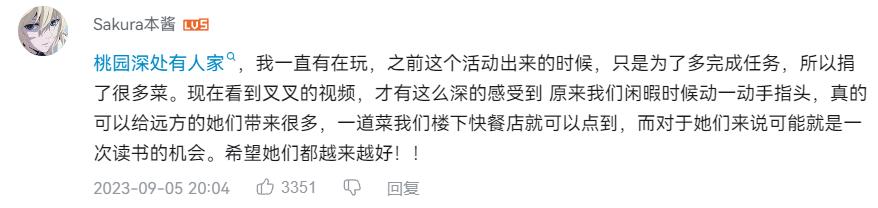 從《桃源深處有人家》上線到現在的一年半里,這款遊戲就舉辦過六期公益活動。第一期就是前面提到的「520營養餐」公益,玩家在遊戲裏製作「蛋炒飯」「魚香肉絲」並捐出,這些食物就會成爲捐贈給山區學生的營養餐。這期活動目標捐贈量爲200萬,結果最終達成2125萬,超額10倍完成目標。而且隨着一些UP主的跟蹤報道,玩家也獲得了真實的反饋,感受到做公益的意義。