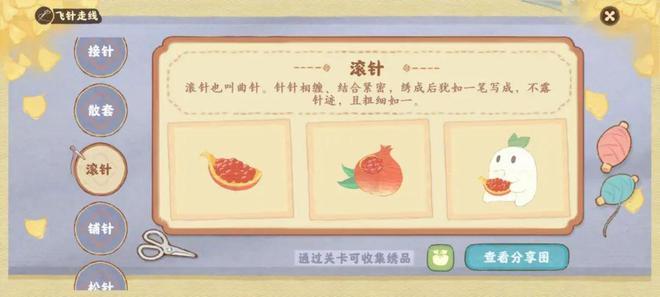 這次聯動中,遊戲裏不僅1:1還原了16幅精美刺繡作品,還對這些作品進行了文字賞析,並且通過二次創作,讓美麗的刺繡與憨態可掬的蘿蔔人結合到一起,給人新鮮的視覺體驗,最後還用「飛針走線」「繡眼巧辨」等小玩法增強互動感。