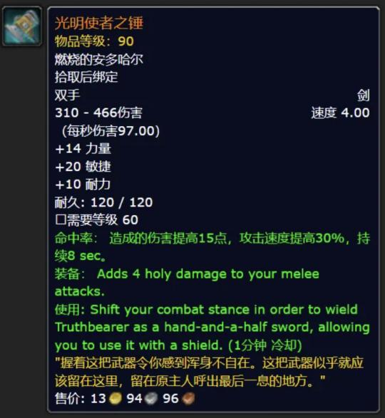 但考慮到光明使者之錘的屬性超級炸裂,不僅有4.0的速度,而且還有常駐的力敏耐和超強特效。武器命中時有幾率提高15點傷害和30%攻擊速度,持續8秒。而且還常駐普攻增加4點神聖傷害的特效。