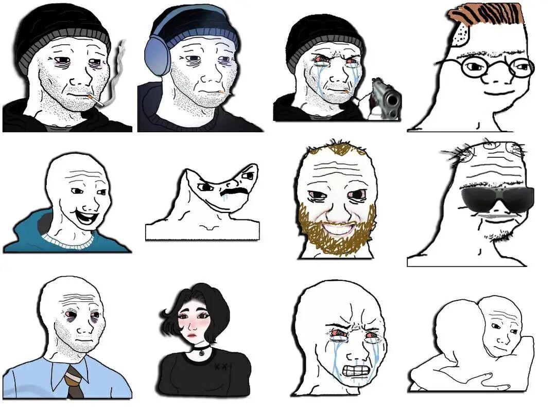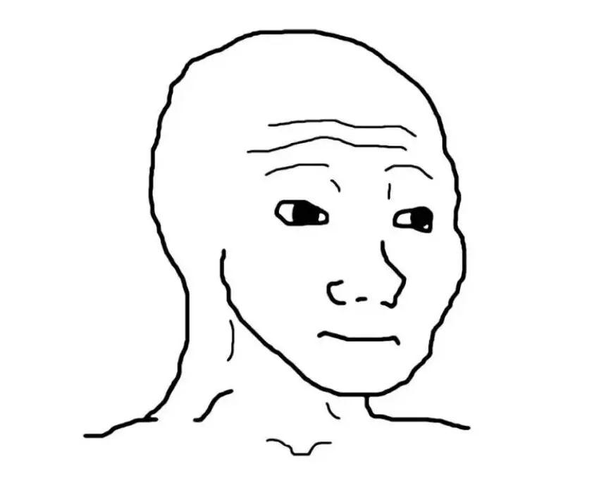 這便是近年來在外網流行的Doomer文化,這張頹喪臉又稱“Wojak臉”,最早於2009年12月16日發佈在一個叫名爲“Sad and Useless”的迷因網站上,結果這張電子簡筆畫卻在4chan論壇上走紅,影響至今。