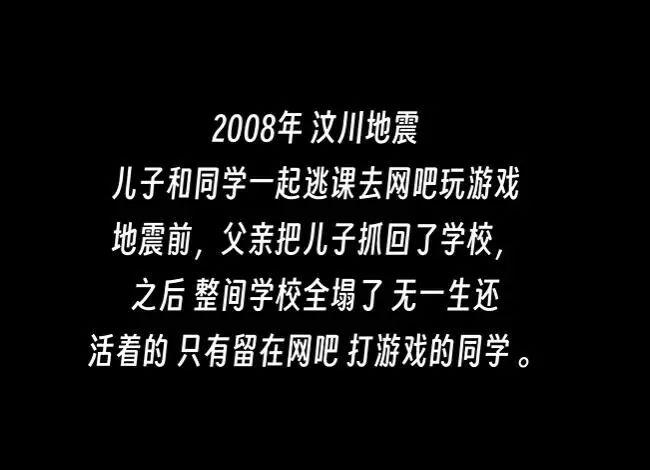 就像當年512汶川大地震前夕,被父親從網吧抓回學校的小孩,他和從藍極速裏被家長抓走的小孩相比,命運列車駛向了不同的方位,可謂造化弄人。