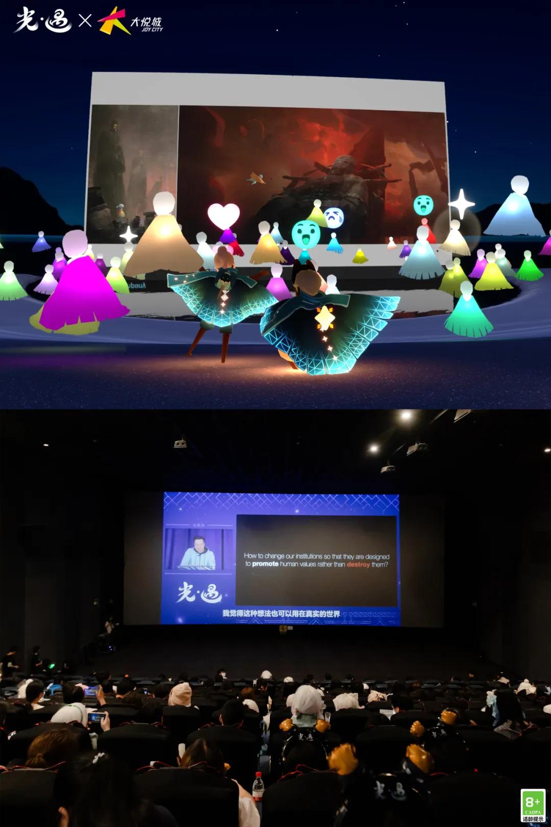 在IMAX影院裏,我面對500位觀衆做線下演講的同時,我在《光·遇》裏的角色也在和近百萬人同時互動,很多人都在遊戲裏堵我,說要“活捉小陳”。很巧的是,當時線上玩家就有人說,你個兒太高,擋住我畫面了,結果在影院裏也有人這麼吐槽。