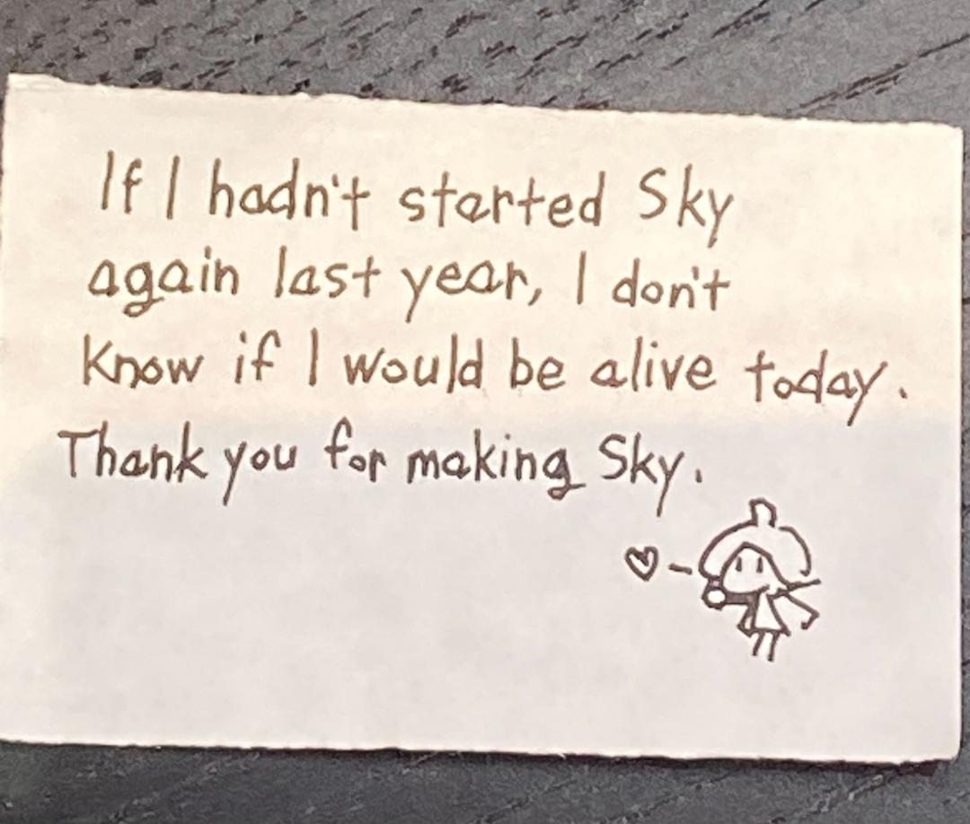 分享歸分享,《光·遇》能做到的是有限的。但起碼,這是一個有人願意聆聽的地方。有人聆聽,也許就有一部分人願意去幫助他們。一旦建立起情感羈絆,這些人就有了堅持下去的理由。我是這麼想的。