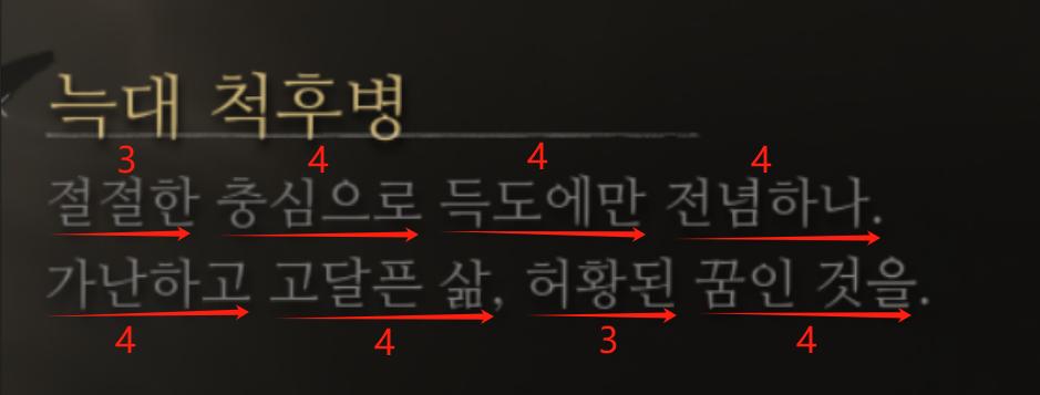 但我們的韓語母語老師說很難完全壓韻。因爲韓國的詩句,和我們的不太一樣。比起押韻,韓文更在乎工整,他們有所謂的“三四調”或“四三調”。所以在翻譯圖鑑中的定場詩或者歌詞的時候,在保證原文意思的前提下,首先要儘量讓前後兩句的結構或者字數一致,保證它看上去很工整,而後再努力嘗試押韻。也就是說,工整的優先級會大於押韻。