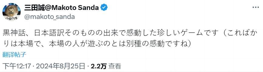 三田誠:“《黑神話》,這是一款極其罕見的,憑日語翻譯本身便足以令我感動的遊戲。(這點對於在本地遊玩的,中國的玩家們來說,應該是種別樣的感動吧!)”