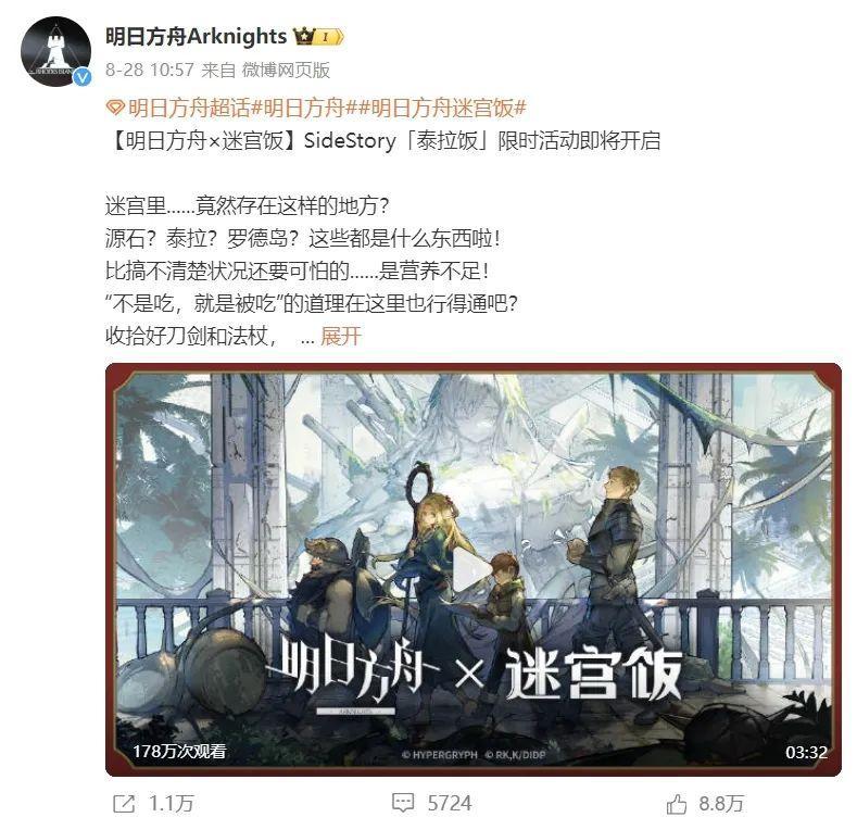 8月27日上午,微博突然出現了一條熱搜:“明日方舟 迷宮飯呢”。