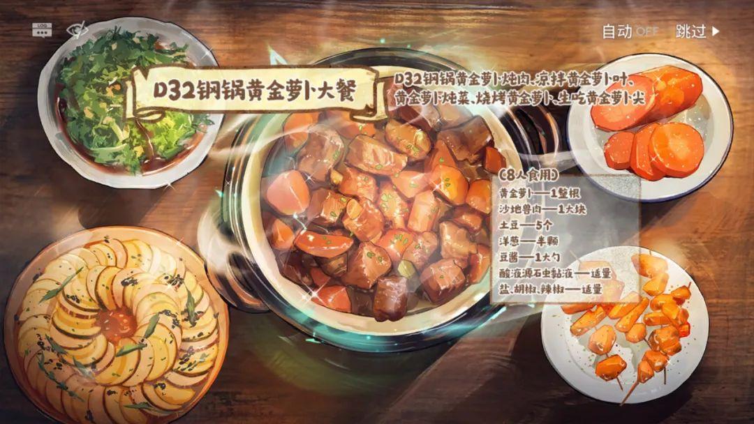 在雷姆必拓,他們又把我們熟悉的升級材料D32鋼煉作鍋,瑪露希爾使用魔法,D32鋼催化,將源石蟲的酸液和黃金胡蘿蔔,做成了一桌大餐。