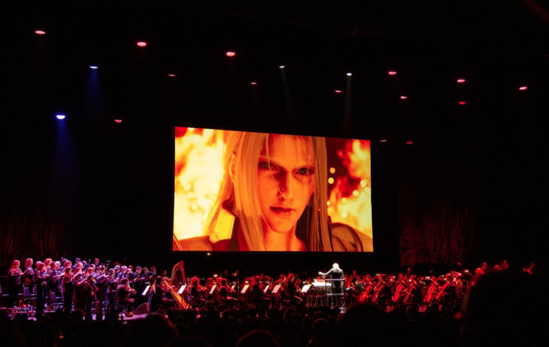 大家都在等待音樂會開始,隨着演奏人員就位,舞臺燈光變暗,中間的屏幕開始播放《最終幻想7 重生》最初的劇情,音樂緩緩奏起了,應援棒也會隨着節奏、舞臺燈光變換顏色,體驗非常不錯。最後的薩菲羅斯主題曲和紅色破壞劍燈海太燃了!