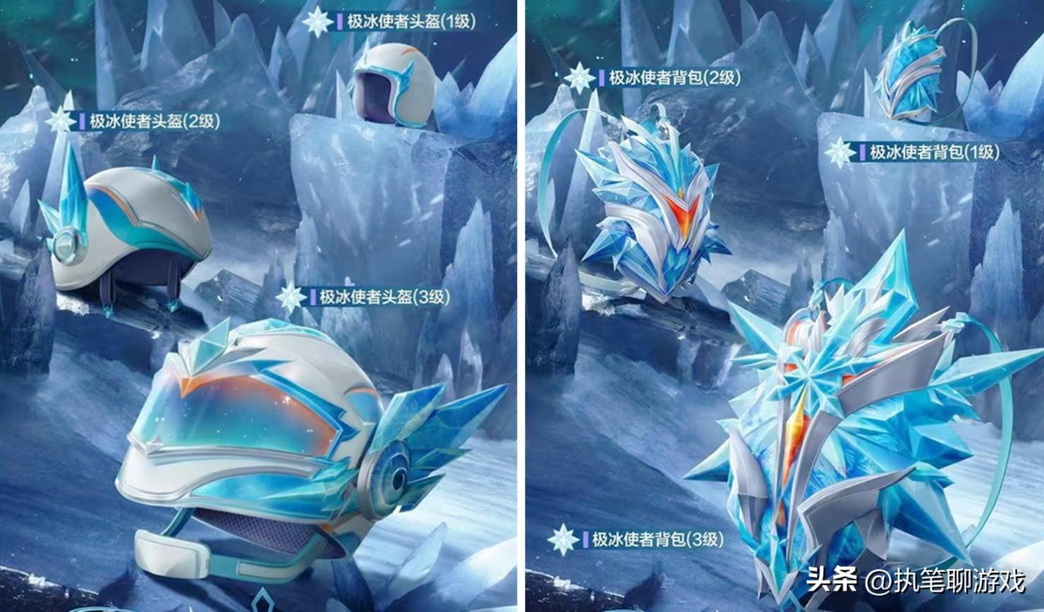接下來要說的是頭盔、揹包,全部被光子重新建模,並且採用同款主題的冰晶材質,其中的3級頭較爲炫酷,護目鏡擁有動態特效;揹包同樣有相似的設定,個人覺得造型比較炫酷,但顏色方面屬於專屬主題,與其他角色或套裝來搭配的話,可能會差強人意。