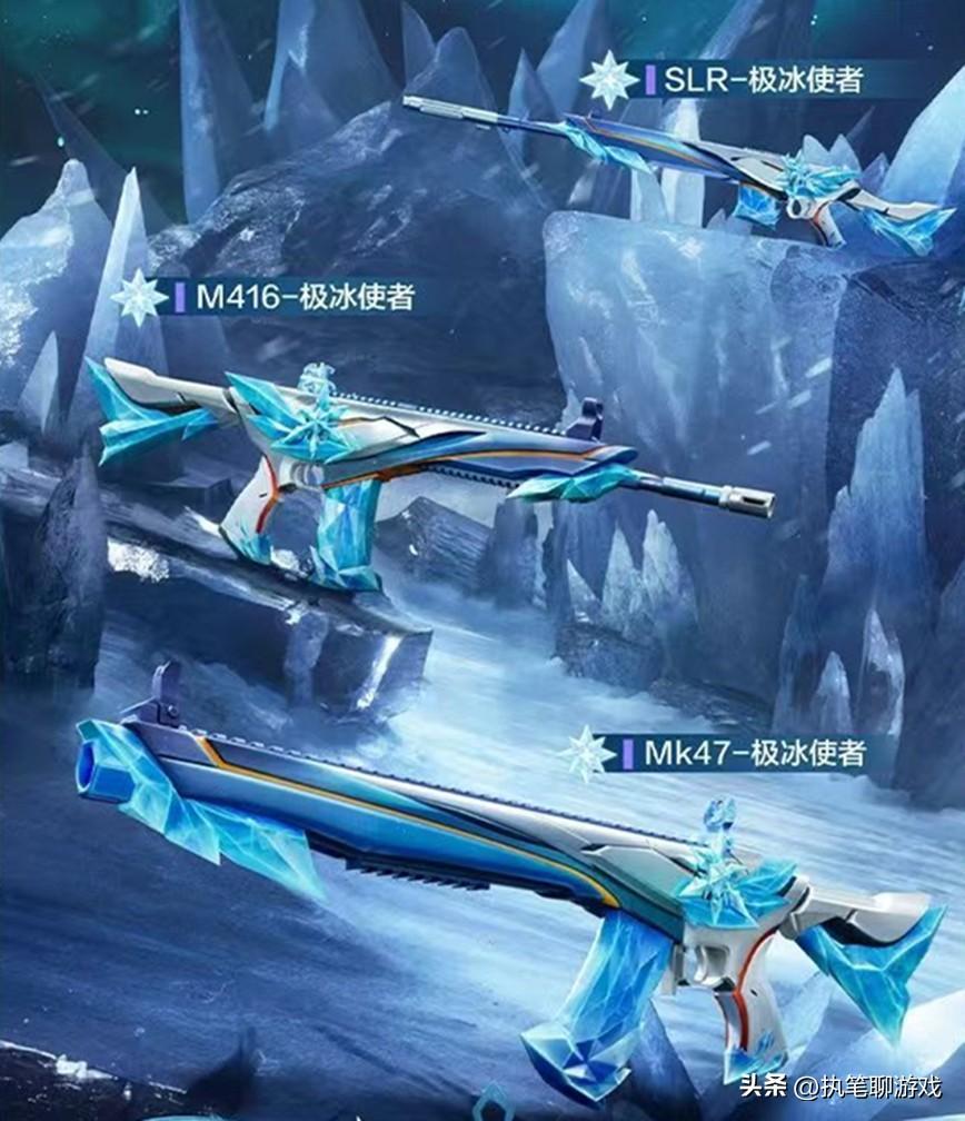 此次的“極冰使者”屬於全紫色等級的小轉盤,在皮膚種類自然也是要一應俱全,其中的槍皮分別是SLR、M416、MK47。
