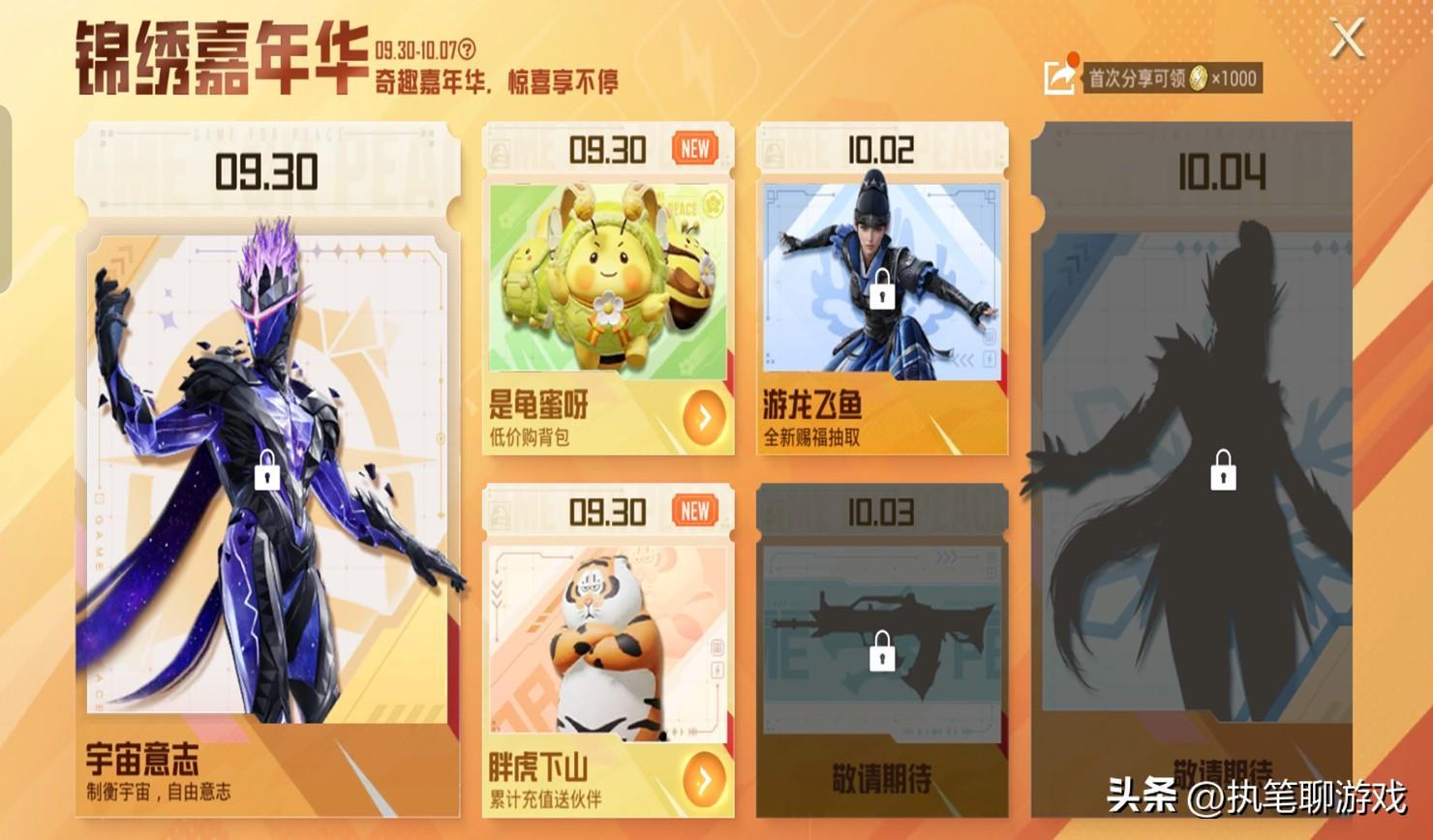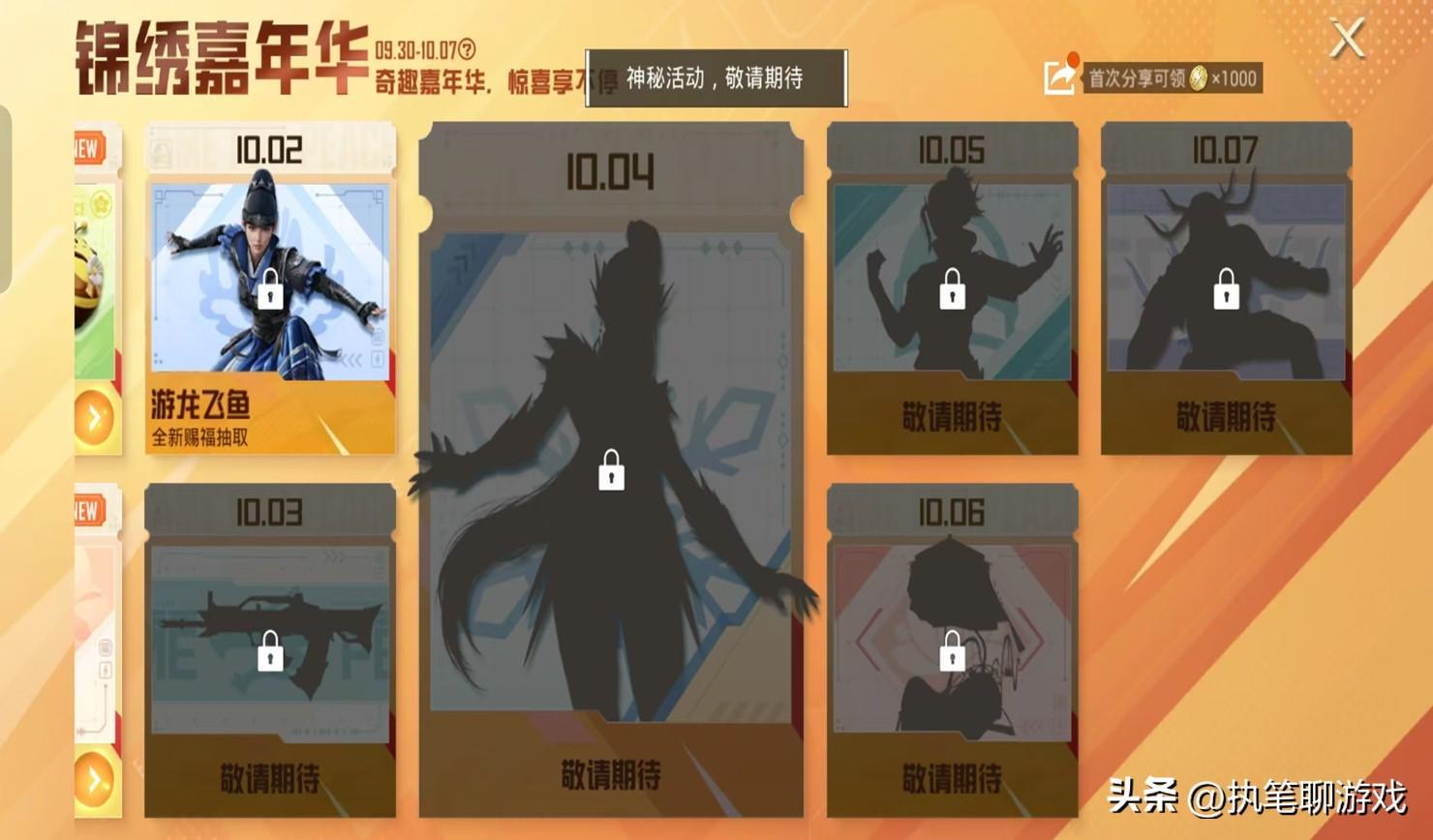 如圖所示,所謂的“錦繡嘉年華”其實是連續7天裏的新皮膚,其中的9.30有宇宙意志、閨蜜揹包、胖虎下山,然後10.2將會出現一個名爲“游龍飛魚”的新皮膚,從10.3到10.7更是每一天都有1個“新神祕”!