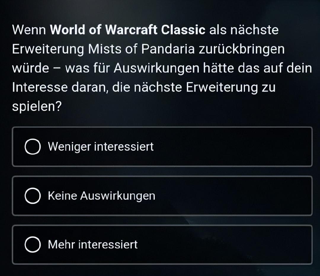 近日,暴雪又一次放出了有關懷舊服是否要開熊貓人之謎的調查問卷,但三個回答選項卻透着一股悲觀的暗示,分別爲不敢興趣、一般、很感興趣。這基本上也透露了暴雪的態度,那就是有些不太看好熊貓人之謎這個版本,以及整個懷舊服未來的前景發展方向了。
