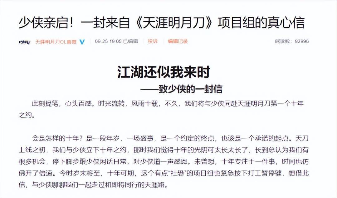 爲了迎接十週年的到來,《天涯明月刀》最近的大動作不斷,既公佈了不氪金的手遊賽季服存在,又爆料了端遊秋季資料片《時光吹雪》的具體內容。近日,天刀官方更是對玩家做出了七大承諾。