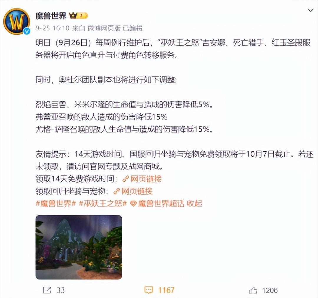 9月25日,《魔獸世界》WLK國服迎來了奧杜爾第六次削弱,烈焰巨獸、米米爾隆的生命值與造成的傷害降低5%,弗蕾亞召喚的敵人造成的傷害降低15%,尤格-薩隆召喚的敵人生命值與造成的傷害降低15%。