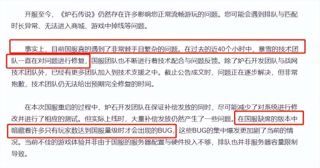 但大量玩家的湧入卻讓把《爐石傳說》給搞崩潰了,遊戲在迴歸首日就出現了排隊15分鐘的卡門BUG,跟匹配超30分鐘的對戰BUG,嚴重影響了玩家的遊戲體驗。