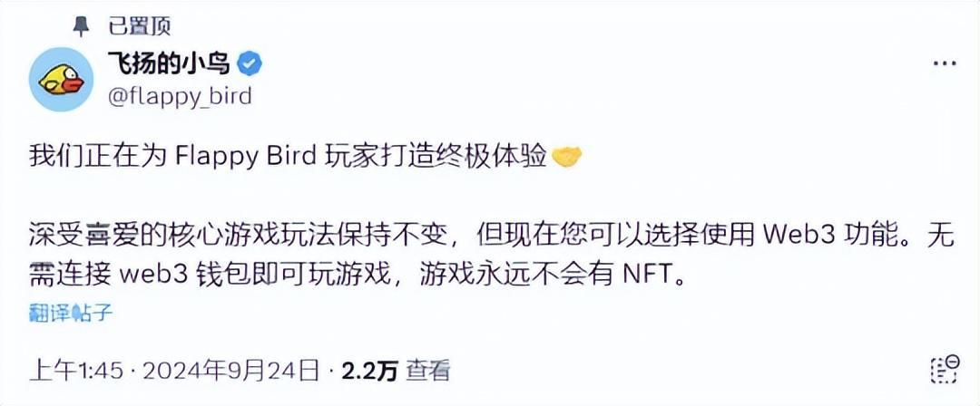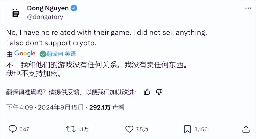 這搞得原作者Dong Nguyen 不得不找回 7 年沒使用的社交媒體登錄密碼,在上面否認三連:這款遊戲不是他製作的,已經與他沒有任何關係,他不支持加密貨幣。