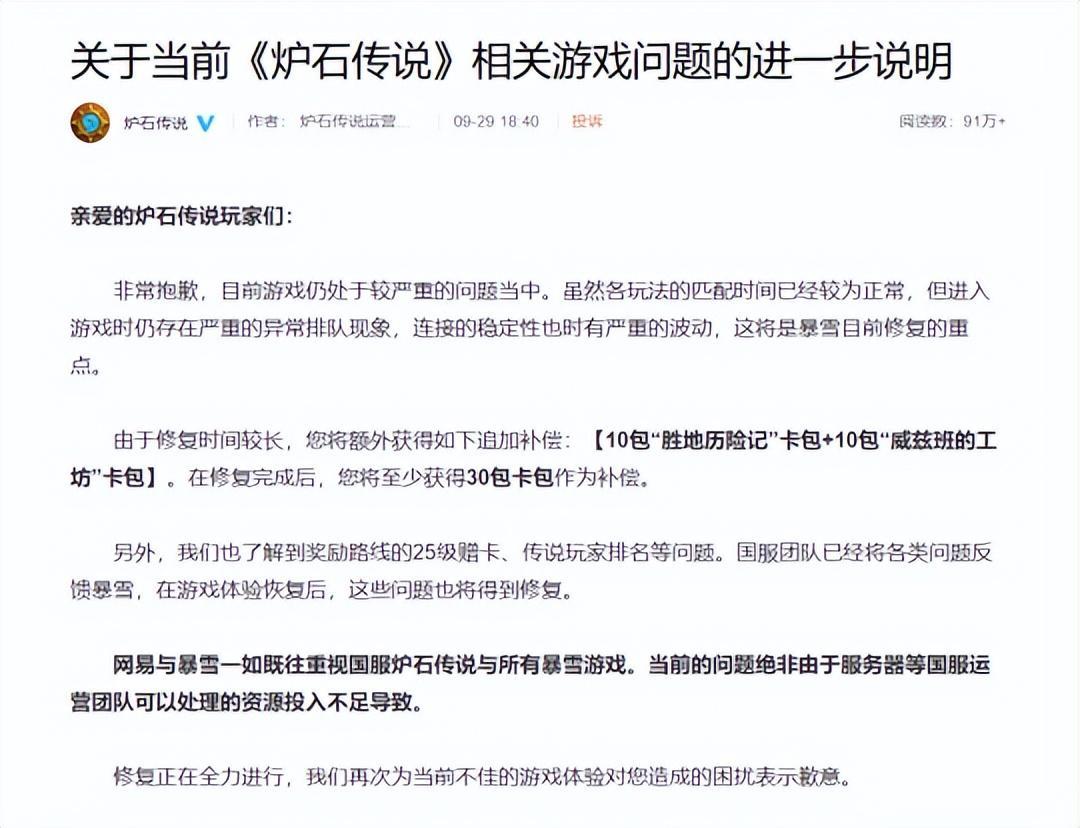 後續,在這個BUG又持續幾天後,國服方面也是追加了補償,多送了10包“勝地歷險記”卡包+10包“威茲班的工坊”卡包,並表示最後會按照BUG被修復的時間點,持續追加卡包的補償。