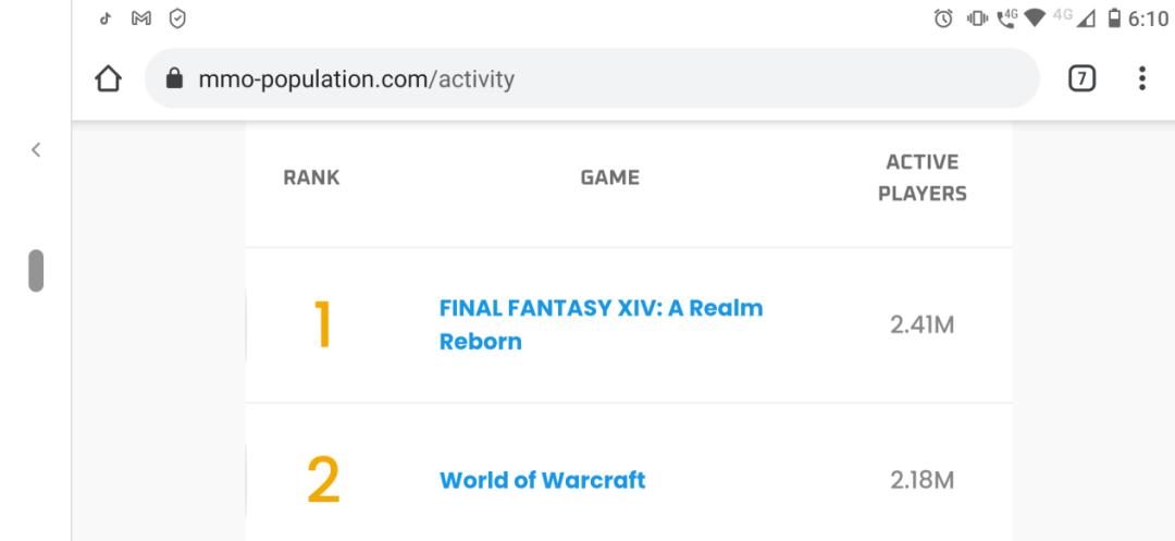 2021年5月,MMO Populations顯示FF14活躍用戶數量位居第一。