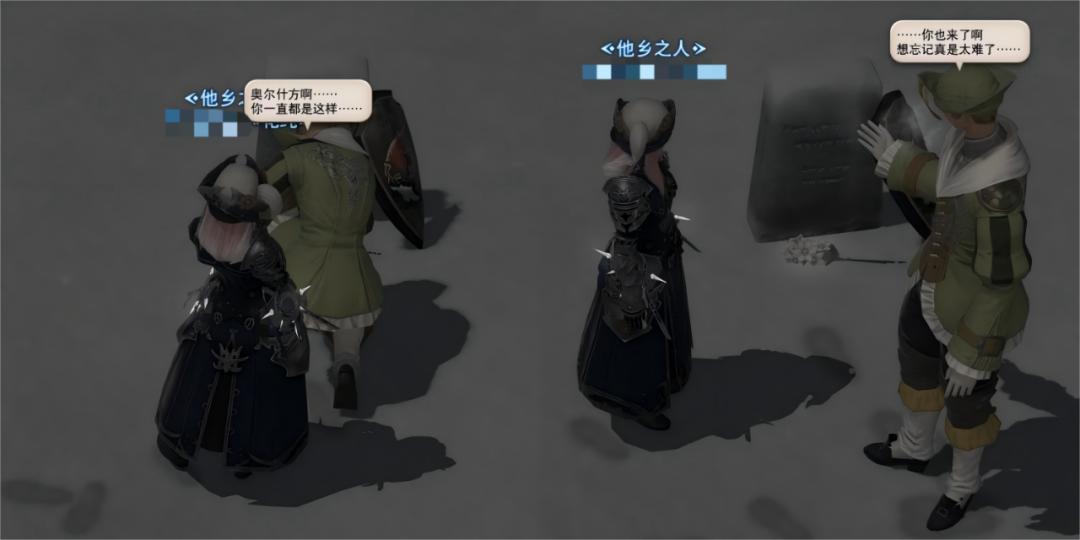 比如在3.0劇情中,NPC奧爾什方爲玩家擋下致命傷後去世後,並沒有就此徹底從遊戲裏消失,你仍能察覺到奧爾什方在世界裏留下的痕跡——在庫爾扎斯的神意之地,矗立着他的墓碑,玩家來到此地,便會遇到正在緬懷悼念的NPC。