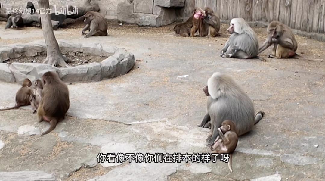 國服官方時常也會和玩家一起玩梗,像是絲瓜前往上海野生動物園領養狒狒的視頻,就有不少玩家評論互動。他給領養的小狒狒取名十四。狒狒一家子坐在樹下,看起來就像海都大水晶等着排本的玩家。