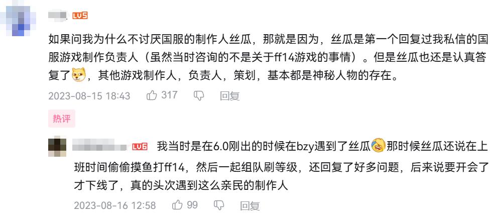 國服制作人絲瓜同樣沒啥架子,經常和FF14玩家互動交流,有時上班摸魚偷偷打FF14,還會在遊戲裏耐心回覆路人玩家的問題。單看他的B站空間,你甚至可能猜不到這是個製作人級別的人物,倒像個普通玩家——團滅時會嘆氣,打絕本會死很多次,好不容易打過了也會手舞足蹈。