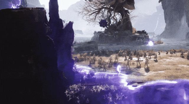 嶼界的出場動畫也十分震撼,它以立場擴散的方式,刷新了玩家新手期走過的、見過的各個地方,並且會在原本荒涼的地面上生成新的地貌,甚至在原本的山石之上,刷出一隻威嚴的巨獸。