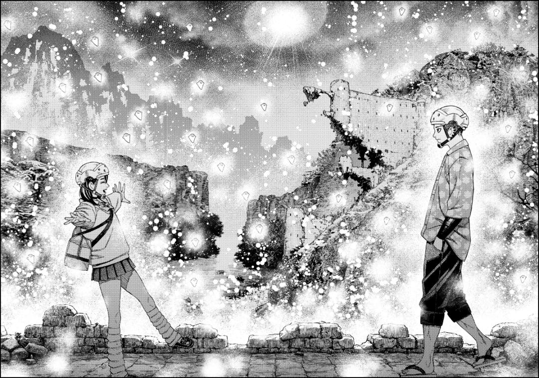 ①是即使連載了好幾年,龍幸伸還是會搞一點這種曖昧出來。在最近的章節中,綾瀨桃誤入了一個微縮世界,邂逅了同樣誤入此地的“頭間雲兒”,兩個人結伴冒險,之後就有了這個跨頁……讀者紛紛叫苦不迭。
