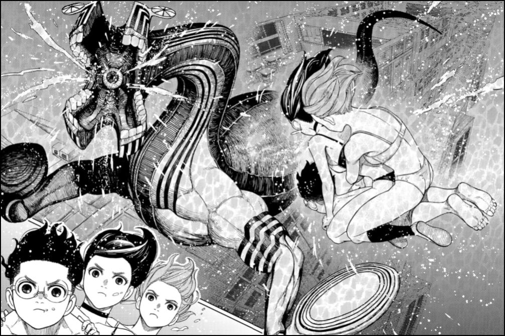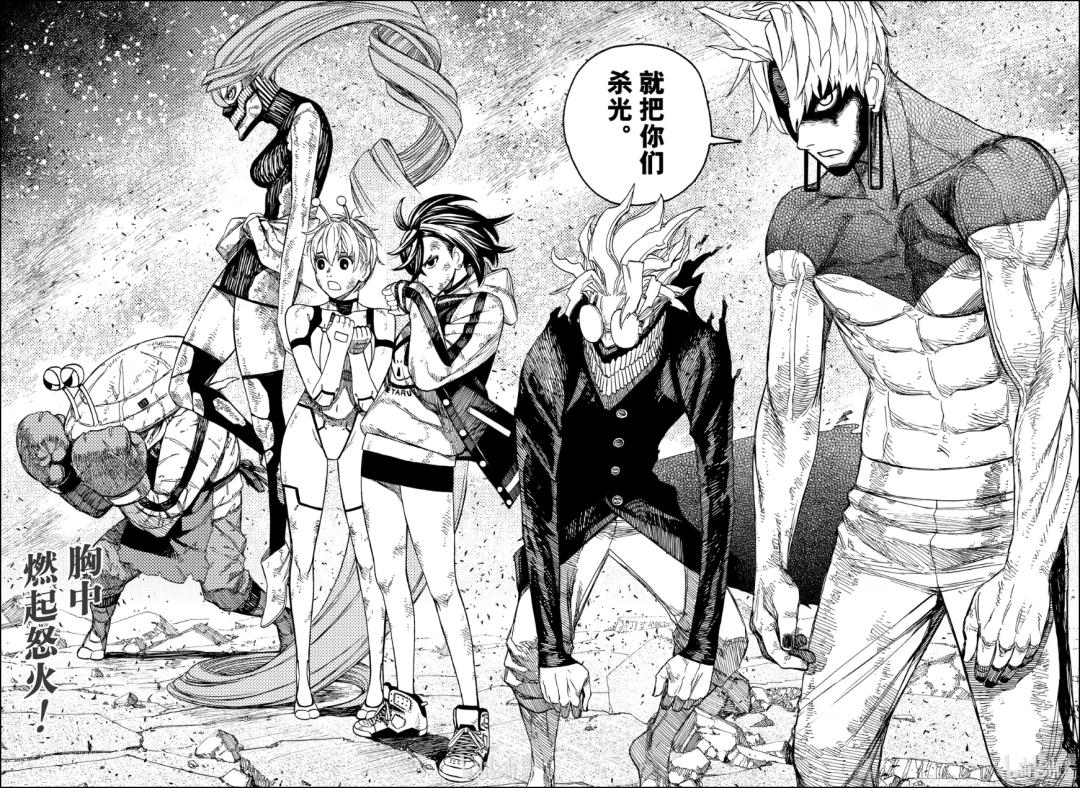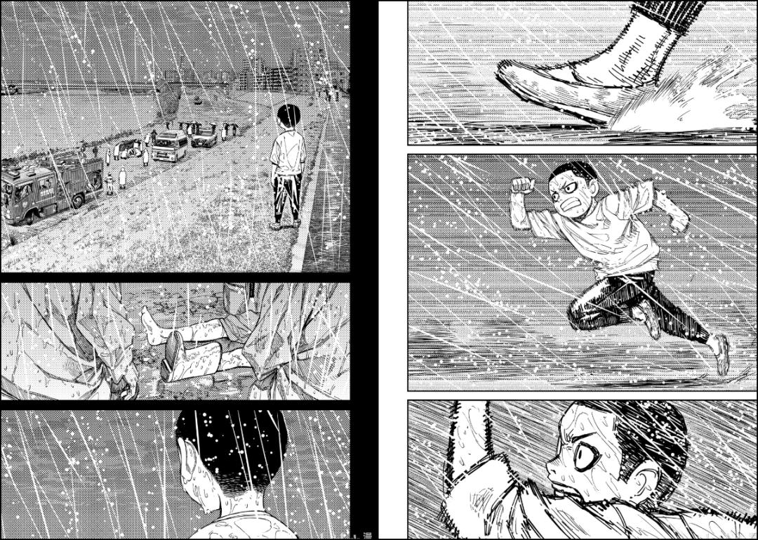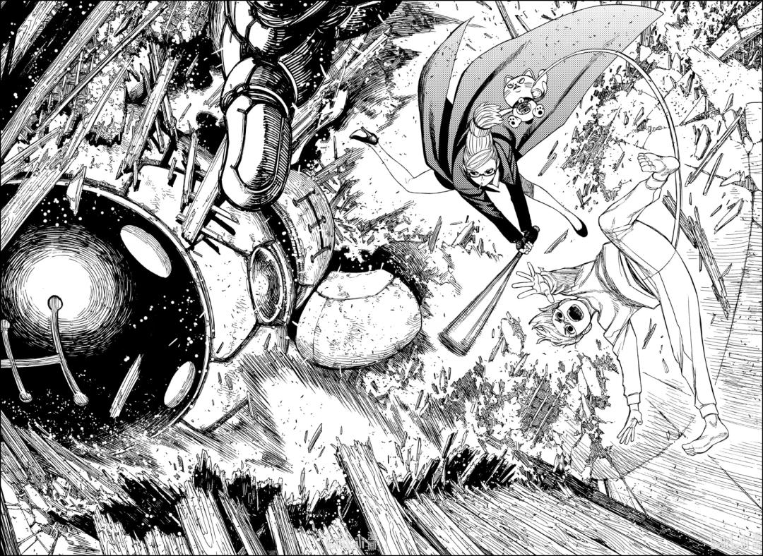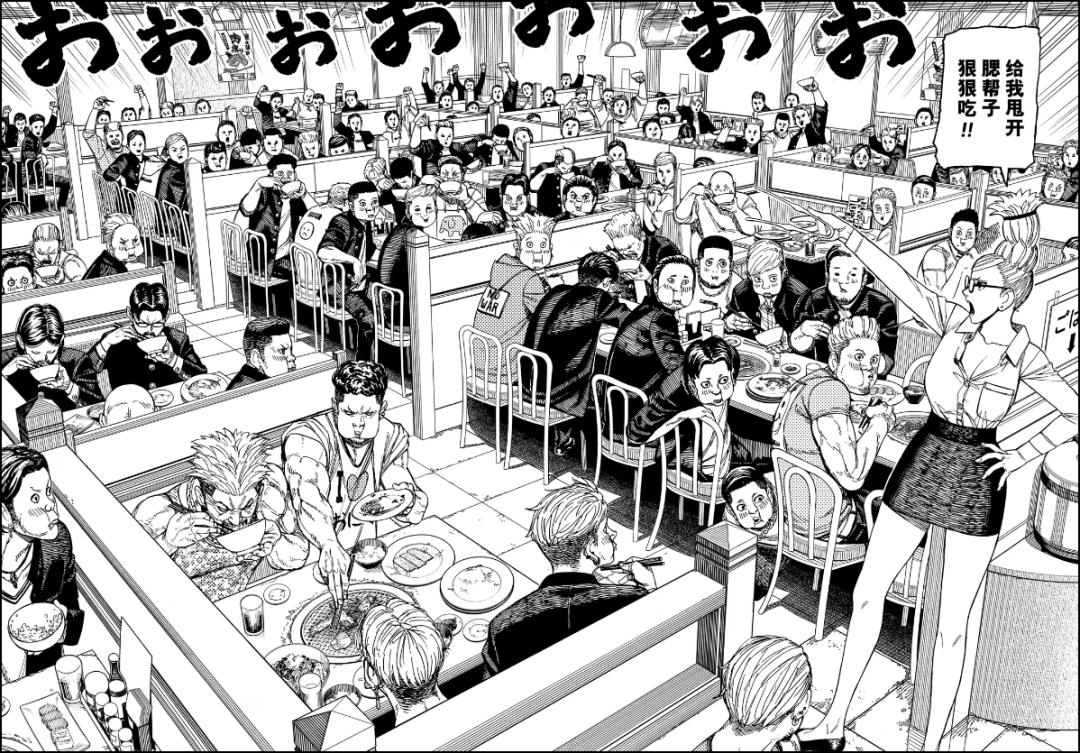 但是在龍幸伸這裏,好像根本沒有什麼所謂的週刊限制,細節拉滿的跨頁非常常見,而戰鬥時衝擊力拉滿的畫面也並不少,更別說最爲基本的角色刻畫,連載開始是什麼樣,現在就還是什麼樣。