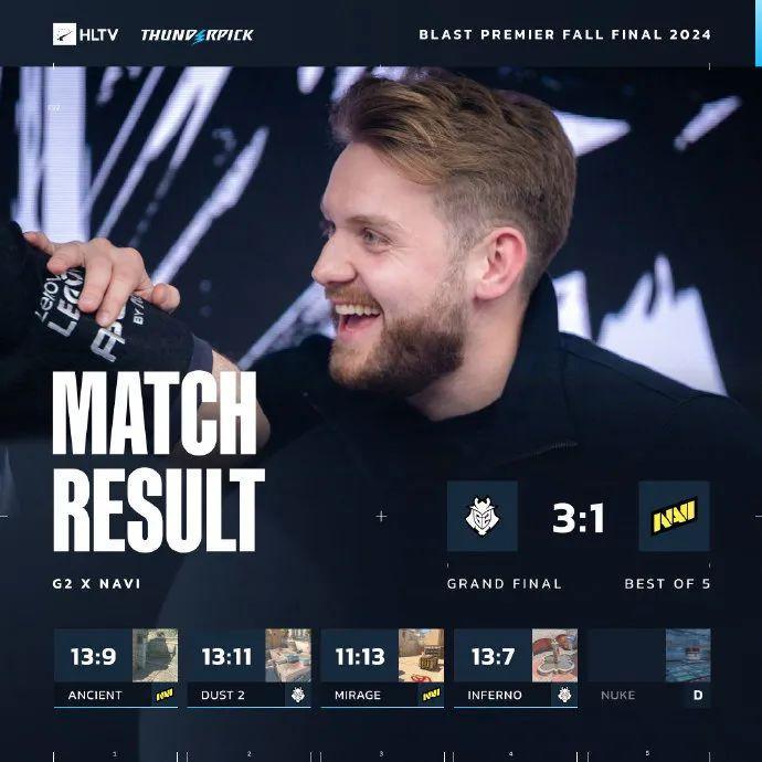 昨晚,在2024 BLAST秋季總決賽上,G2以3比1擊敗NAVI,奪得賽事冠軍。小孩m0NESY拿到賽事MVP。