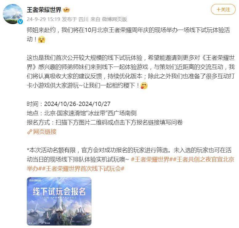 近日,《王者榮耀世界》官方宣佈,將在10月北京王者榮耀週年慶的現場,舉辦遊戲首次較大規模的試玩活動。
