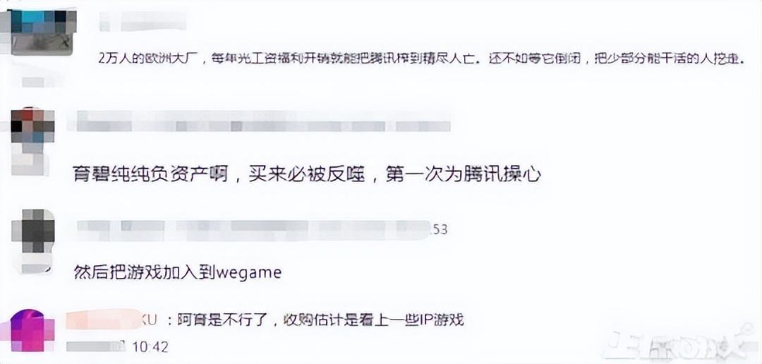 對於騰訊的收購有網友表示,2萬人的歐洲大廠,每年光工資福利開銷就能把騰訊榨到精盡人亡,還不如等它倒閉,把少部分能幹活的人挖走。還有網友表示,育碧純純負資產啊,買來必被反噬,第一次爲騰訊操心。還有網友調侃,(收購完成後)然後把遊戲加入到Wegame。還有網友直言,阿育是不行了,收購估計是看上一些IP遊戲。
