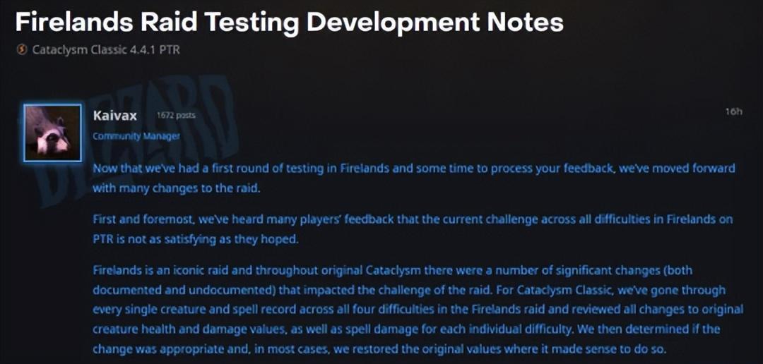 對此,暴雪藍貼的答覆爲他們確實有意削弱了火焰之地的團本難度,覺得玩家會對這些調整感到驚喜。但看到現在論壇有這麼多噴子發力,暴雪現在決定將所有機制和數值恢復到了原版水平,未來也會嚴格按照這一邏輯還原團本,讓玩家獲得足夠的挑戰。