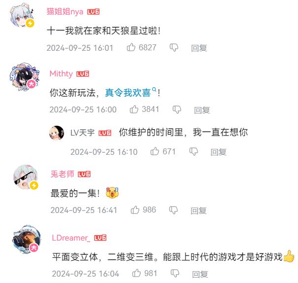 在測試服階段,一些up主就上傳了相關視頻,而玩家們也迫不及待地發表了熱烈的評論。9月25號宿舍PV放出後,更是讓玩家們給出好評。諸如「十一我就在家和天狼星過啦!」「你這新玩法,真令我歡喜!」「你維護的時間裏,我一直在想你」的評論都獲贊數千。
