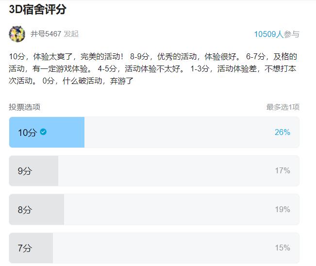 也有UP主發起了有關3D宿舍的評分問卷,截止撰稿時10000多名玩家裏,有26%給出了滿分,總計77%的玩家評分在7分以上。對於一個新功能來說,這樣的評價可以說是非常高了。