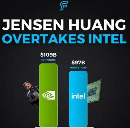 數據顯示,英偉達CEO黃仁勳當前累積的淨資產已達到1090億美元,超過了英特爾的970億美元市值,而英偉達的市值接近3.06萬億美元。