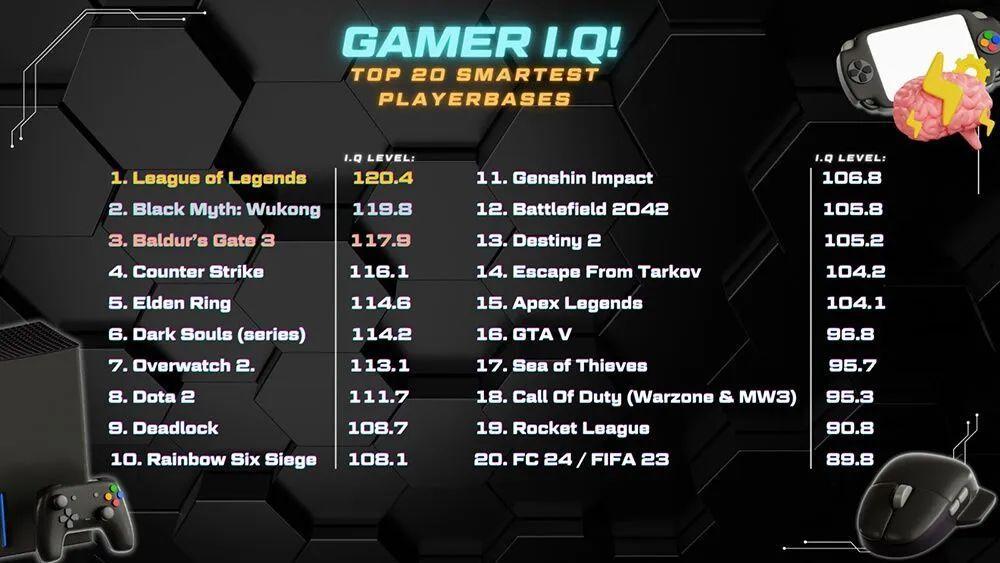 結果顯示,《英雄聯盟》玩家的平均智商最高爲120.4分,《黑神話:悟空》排在了第二名,爲119.8分,第三名則是《博德之門3》,爲117.9分。最後一名則是《FC 24》(以前的FIFA),僅爲89.8分。