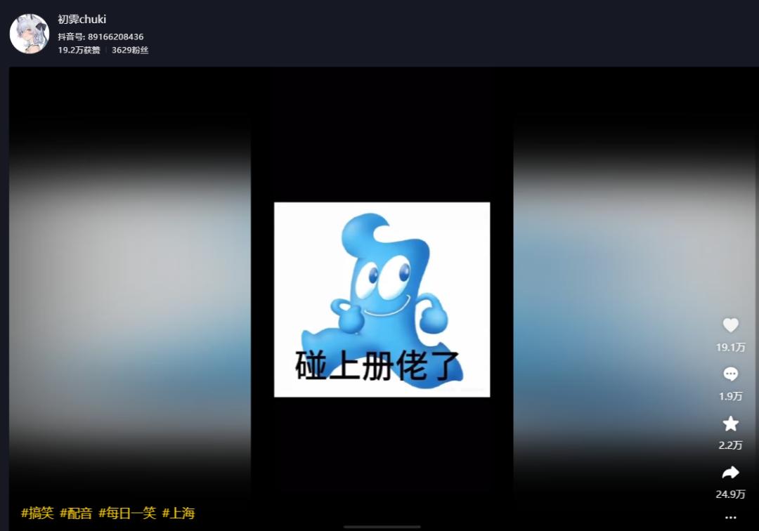 到了9月5日,一位叫@初霽chuki的博主,在抖音發了個配音視頻,用上海話演繹了海寶表情包的配文。這一波堪稱點睛之筆,視頻頭幾天就破了400萬播放,帶起了短視頻平臺的傳播,也徹底將海寶+滬爺衝擊的組合推向大衆。